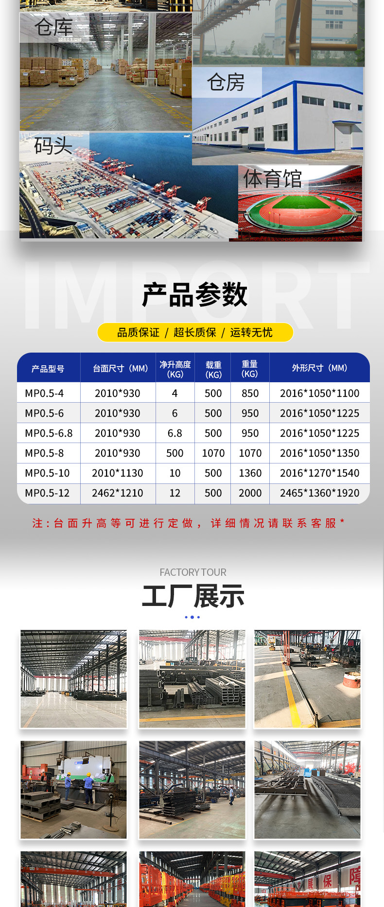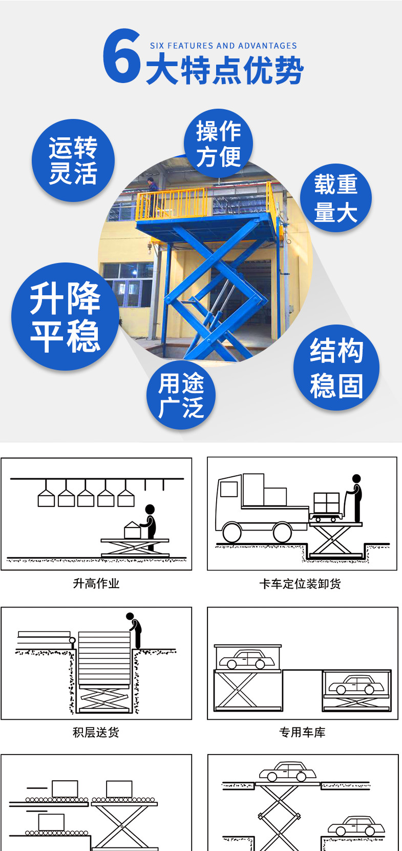 固定式升降機(jī)廣泛應(yīng)用于車間、倉庫高空輸送貨物、汽車4S店、停車場高空輸送汽車、工地、廠房、倉庫、糧庫、車站、賓館、機(jī)場、碼頭、加油站、體育廠、高架管道等高空貨物輸送及高空作業(yè)。室內(nèi)、室外、都可安裝。
