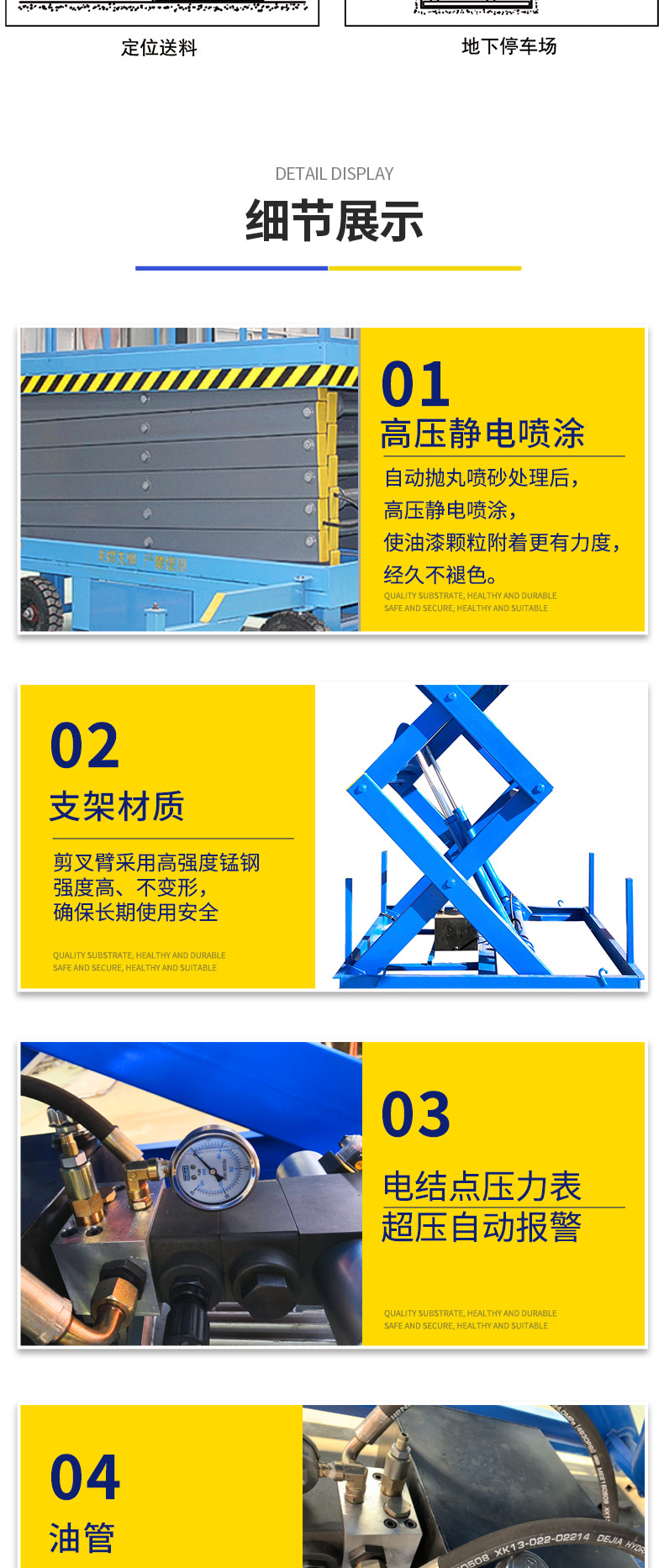 2、升降高度穩(wěn)定性,能滿足大噸位貨物平穩(wěn)舉升.設(shè)有防附,超載安全保護(hù)的液壓系統(tǒng),保障運(yùn)行安全
